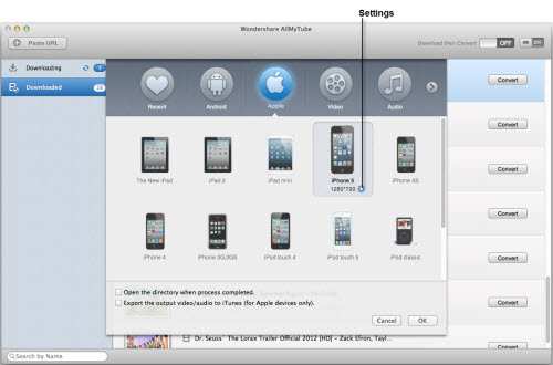 After downloading the songs online via the product, find the downloaded songs in the Downloaded list and click the Convert button. In the Audio tab, choose .mp3 or. m4a format to convert your songs directly. You can check the option of Export the output video/audio to iTunes (for Apple devices only) at the bottom of this interface. In this way, the output songs will be loaded to iTunes automatically after the conversion.