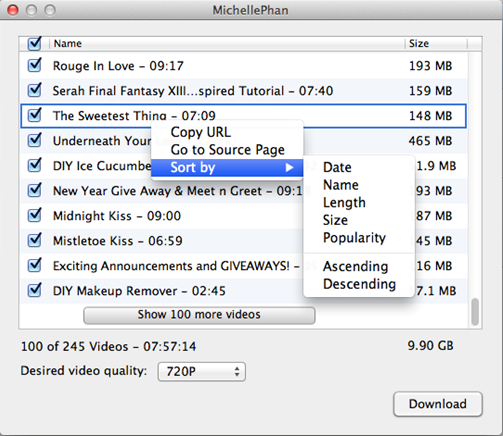 You can select the videos you want to download. Right click the video, you can arrange the videos according to the Name, Date, Length, Size, Popularity of the videos. And you can choose Ascending or Descending.