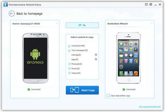 Step 3. Select the data you want to transfer, in this guide I will select contacts as a sample. And then click "Start Copy". That's all, the Phone transfer will copy the contacts from Android to iPhone automatically.